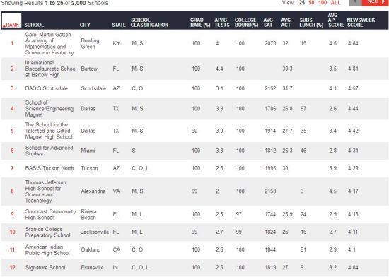 綜合這些因素后,位于美國肯塔基州Bowling Green市的Carol Martin Gatton Academy ofMathematics andScience以4.8的綜合得分位居榜首,屈居亞軍的則是佛羅里達(dá)州Bartow市的InternationalBaccalaureate School,綜合得分為4.81分,緊隨其后的是亞利桑那州Scottsdale的BASISScottsdale,其總分為4.57。上圖是排名前25位的學(xué)校的信息。