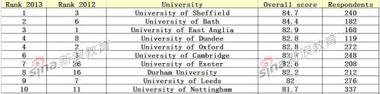 同時(shí),在2014年的排名中躋身前10名的大學(xué)院校也包括從去年的26名上升至今年第7名的埃克塞特大學(xué)、杜倫大學(xué)(從16名上升至第8名)和諾丁漢大學(xué)(從11名上升至第10名)。
