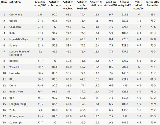 英國《衛(wèi)報(bào)》2014年6月2日發(fā)布的2015年英國大學(xué)排名新鮮出爐了!劍橋大學(xué)連續(xù)四年蟬聯(lián)第一,牛津大學(xué)依然第二,而令人意外的是,圣安德魯斯大學(xué)成了今年的探花,巴斯大學(xué)升至第四,去年的老三倫敦政治經(jīng)濟(jì)學(xué)院卻降到了第7。下面一起來看一下2015衛(wèi)報(bào)英國大學(xué)排名情況。
